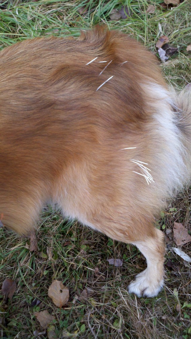 Chico, Dakota and I went for a ride this morning. As usual, Chico did his own thing; running about off in the woods, but not far away. At the end of the ride I saw something sticking up out of the fur on his haunches. I thought to myself, “those are funny looking leaves stuck in his coat.” On closer examination, I realized they were porcupine quills. Visions of a Sunday morning trip to the emergency vet danced through my head for a moment.