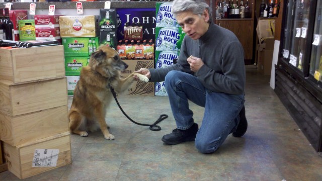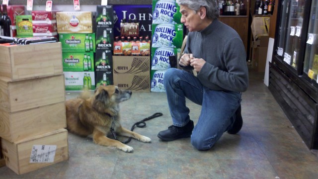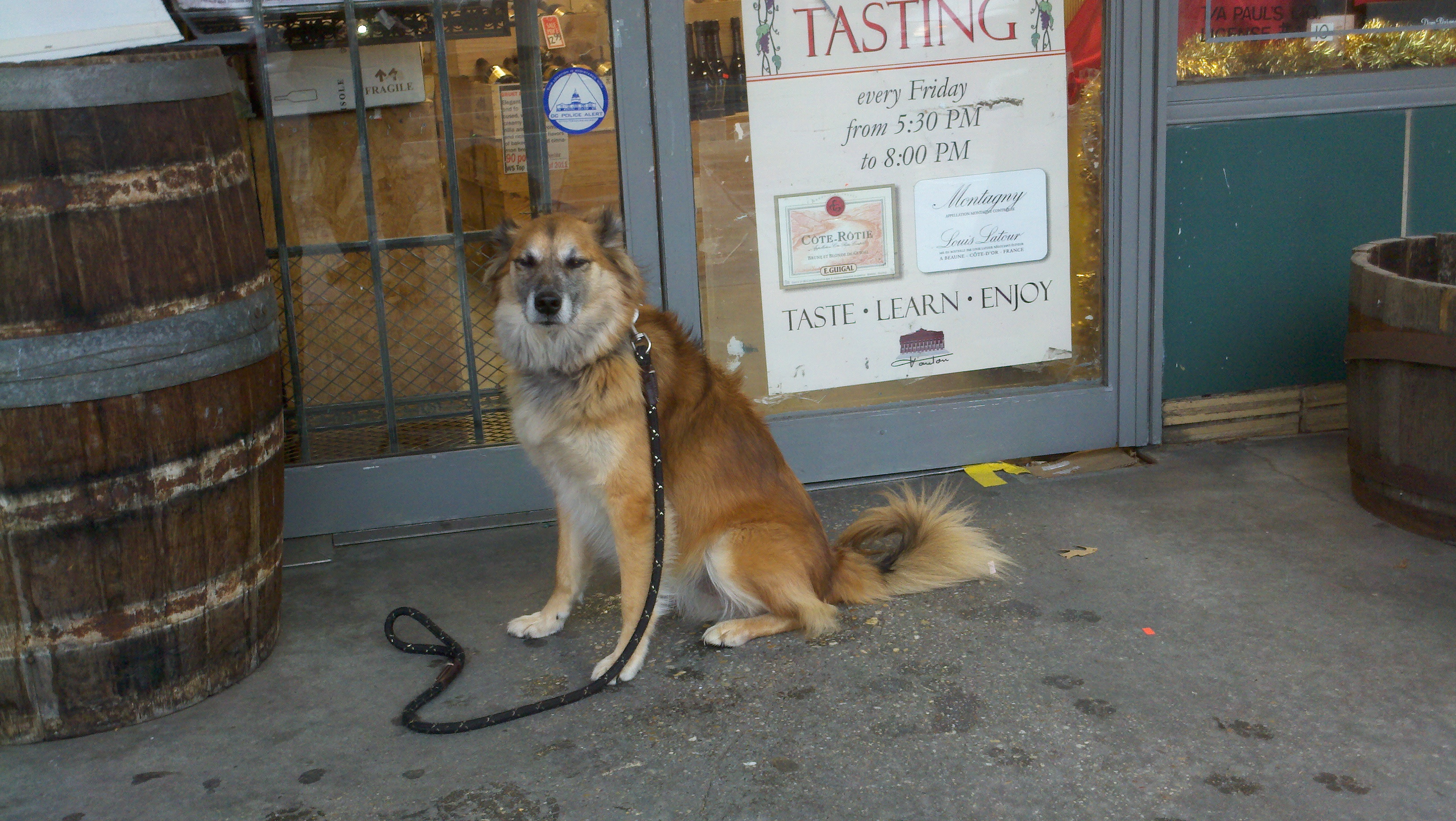 Chico will do a sit-stay well enough that I felt OK backing off to take a picture of him here in front of the entrance to Paul's.