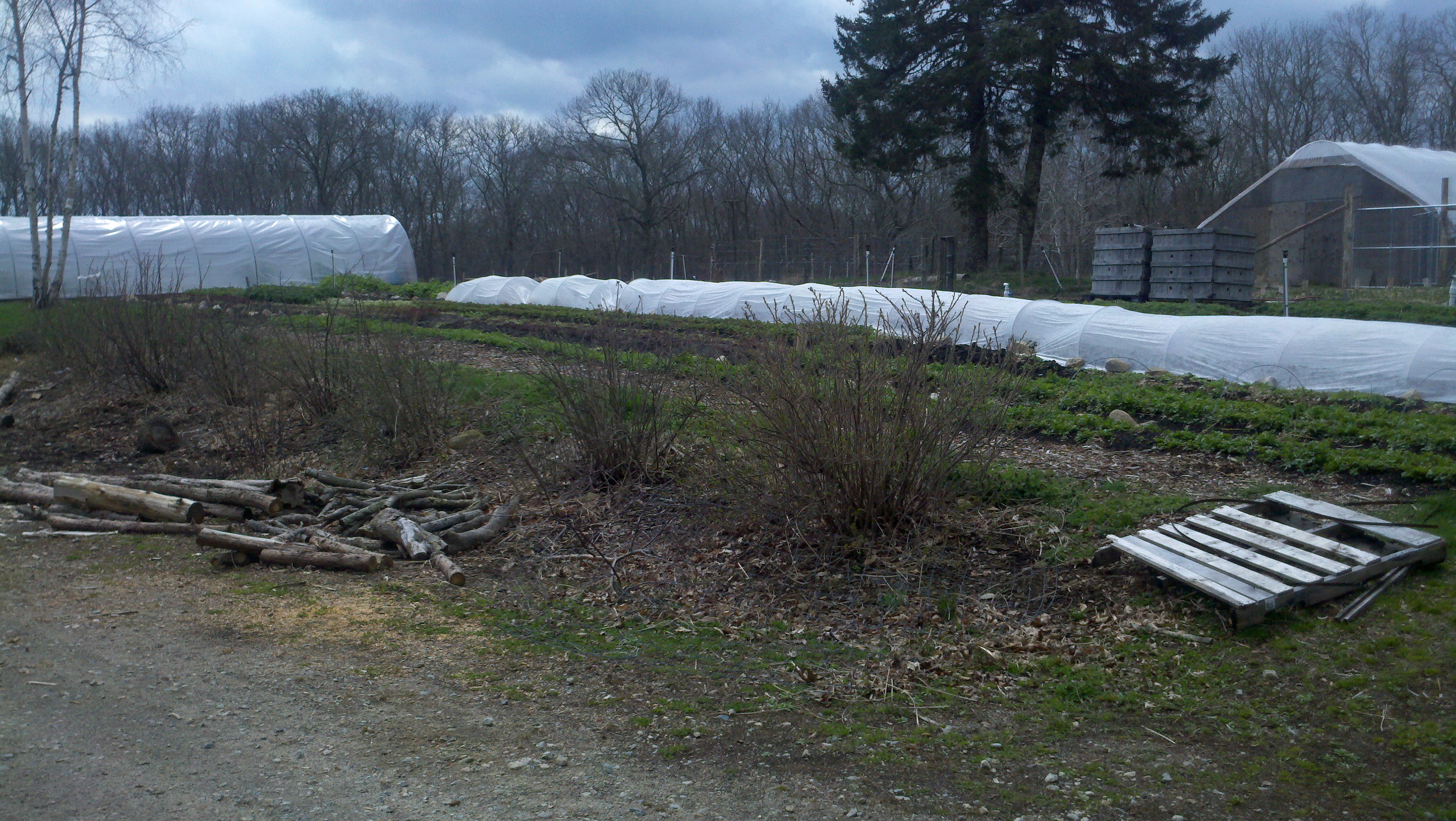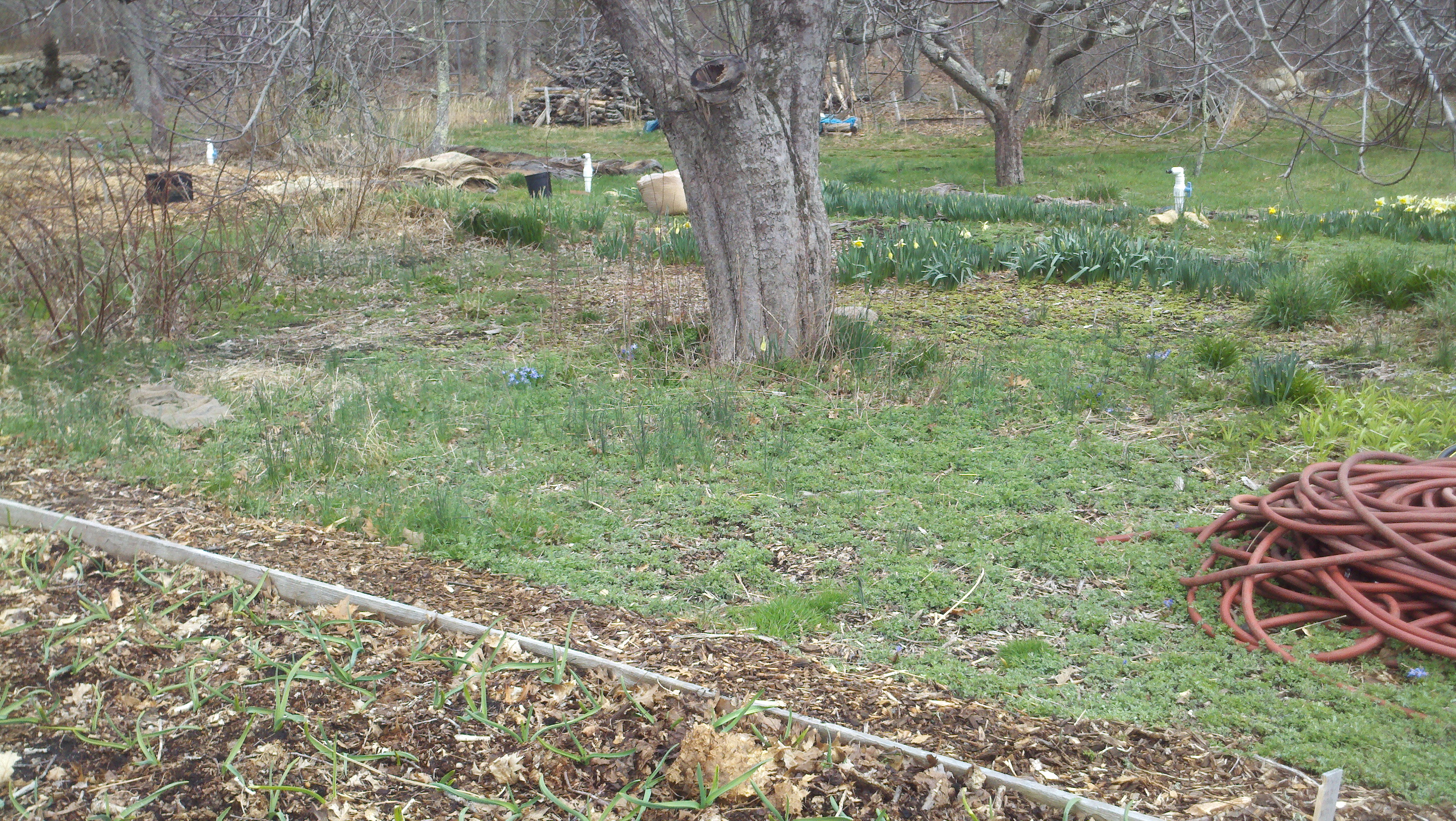The space under this old apple tree is used to produce daffodils for market (they'll bloom and be done before the tree leafs out), there are berry bushes to the left of frame, in the front is a raised bed. Sharp eyes will pick out the wild onion under the apple tree. To most people, wild onion is a weed. Not in this garden. Wild onions, it seems, are used in high-end restaurants, perhaps pickled and use in expensive martinis.