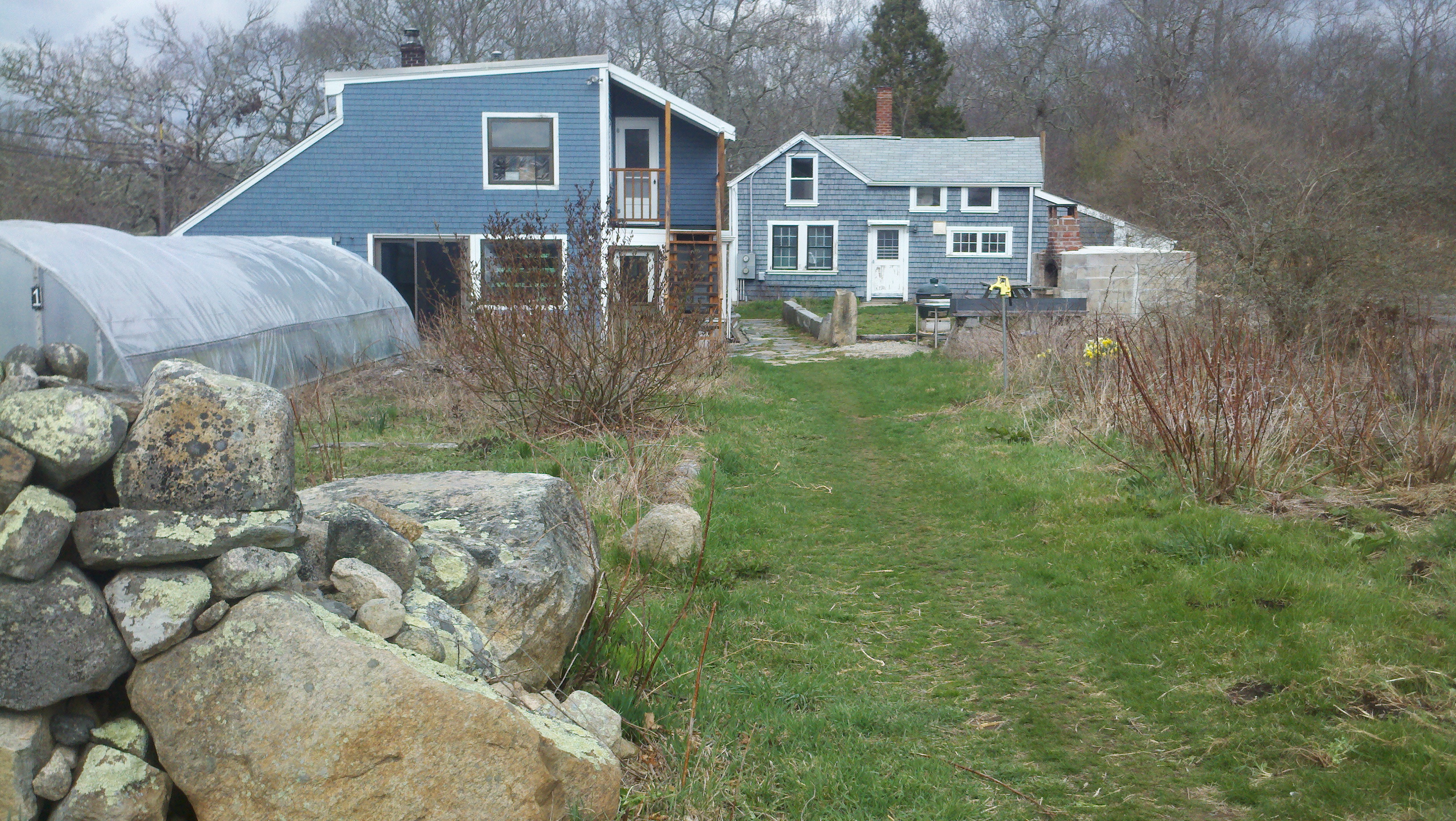 Two little houses that are almost always full of people, greenhouse number one on the left, on the right with a brick chimney is the pizza oven that someone built for a wedding reception a few years ago.