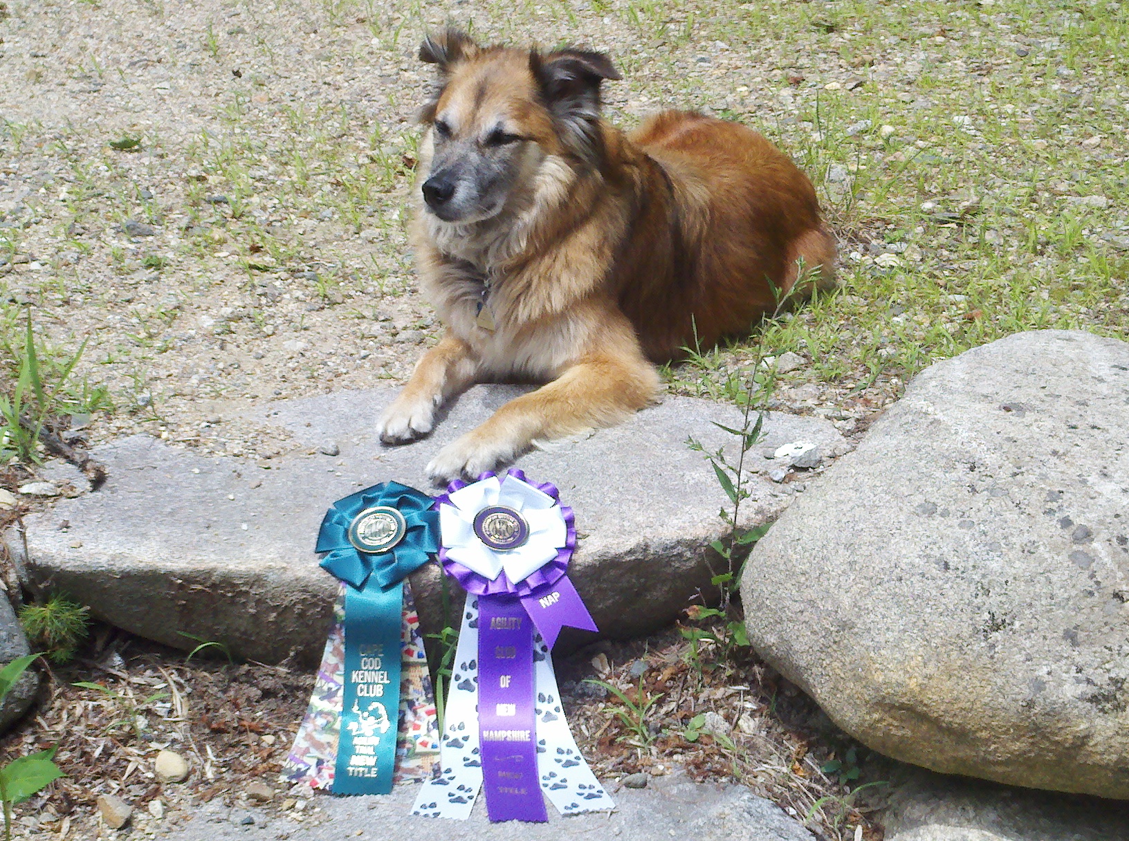 That’s Chico with the ribbons we received for completing the Novice level in Standard and Jumpers classes of American Kennel Club agility trials. It took a year to get them both, but we only compete one or two days every couple of months.