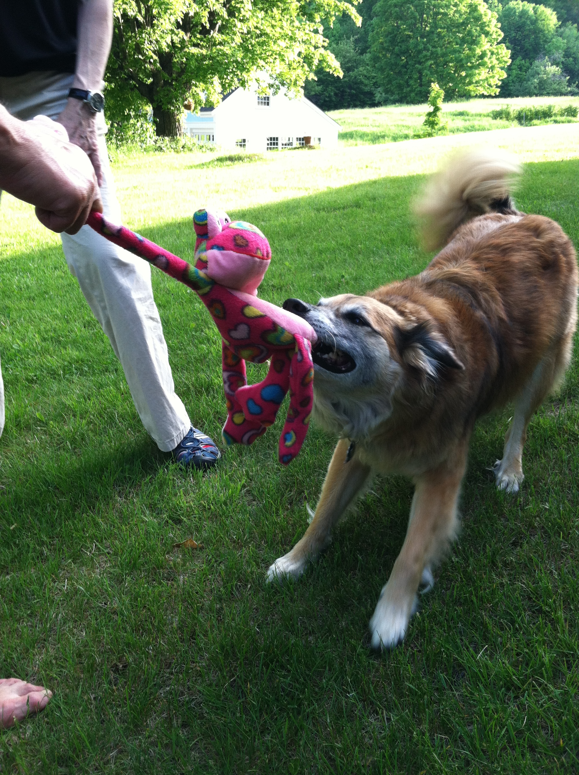 Nancy & Louise came over the other evening and Chico brought out his peace frog and wanted to play tug with Nancy.