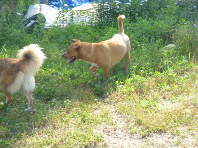 The next morning some neighbors came by for a walk, and there were a couple dogs along too. A Pointer-ish mixed breed, taller than Chico and about twice as heavy, and a good sized Portuguese Water Dog. Everyone was off leash, the other dogs were polite and largely uninterested in Chico, and he was a perfect gentleman.