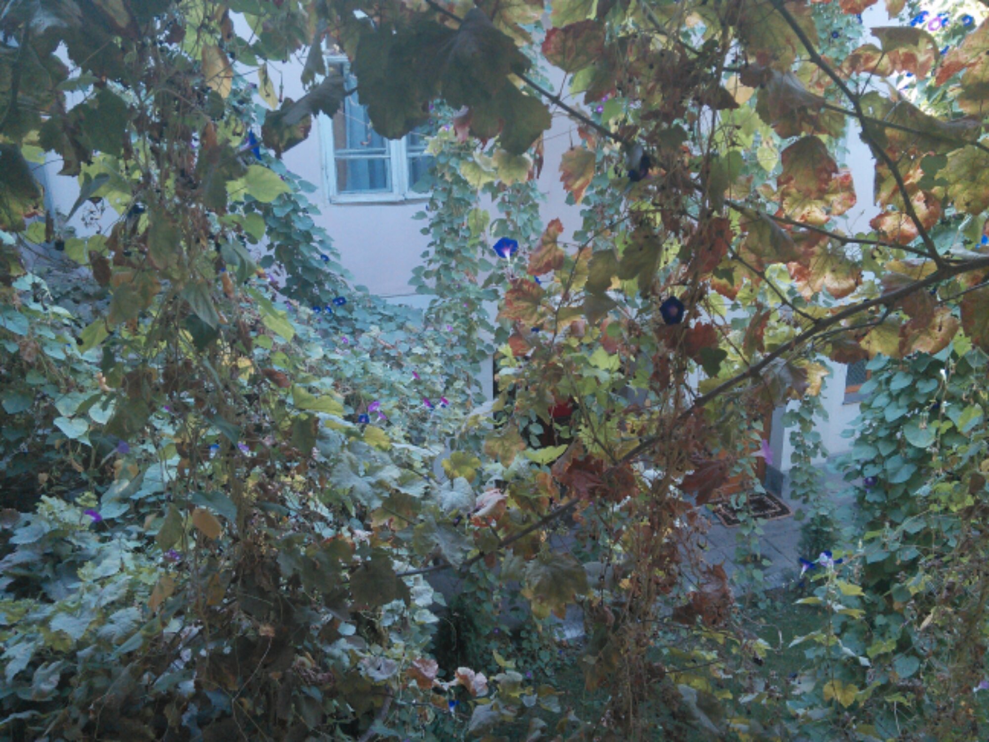 This picture is taken looking out of our room in Samarkand. The exterior of the building is blank walls, inside is a small paradise garden. Morning Glories grow up grape vines, shading the walkways and balconies of the inner courtyard.