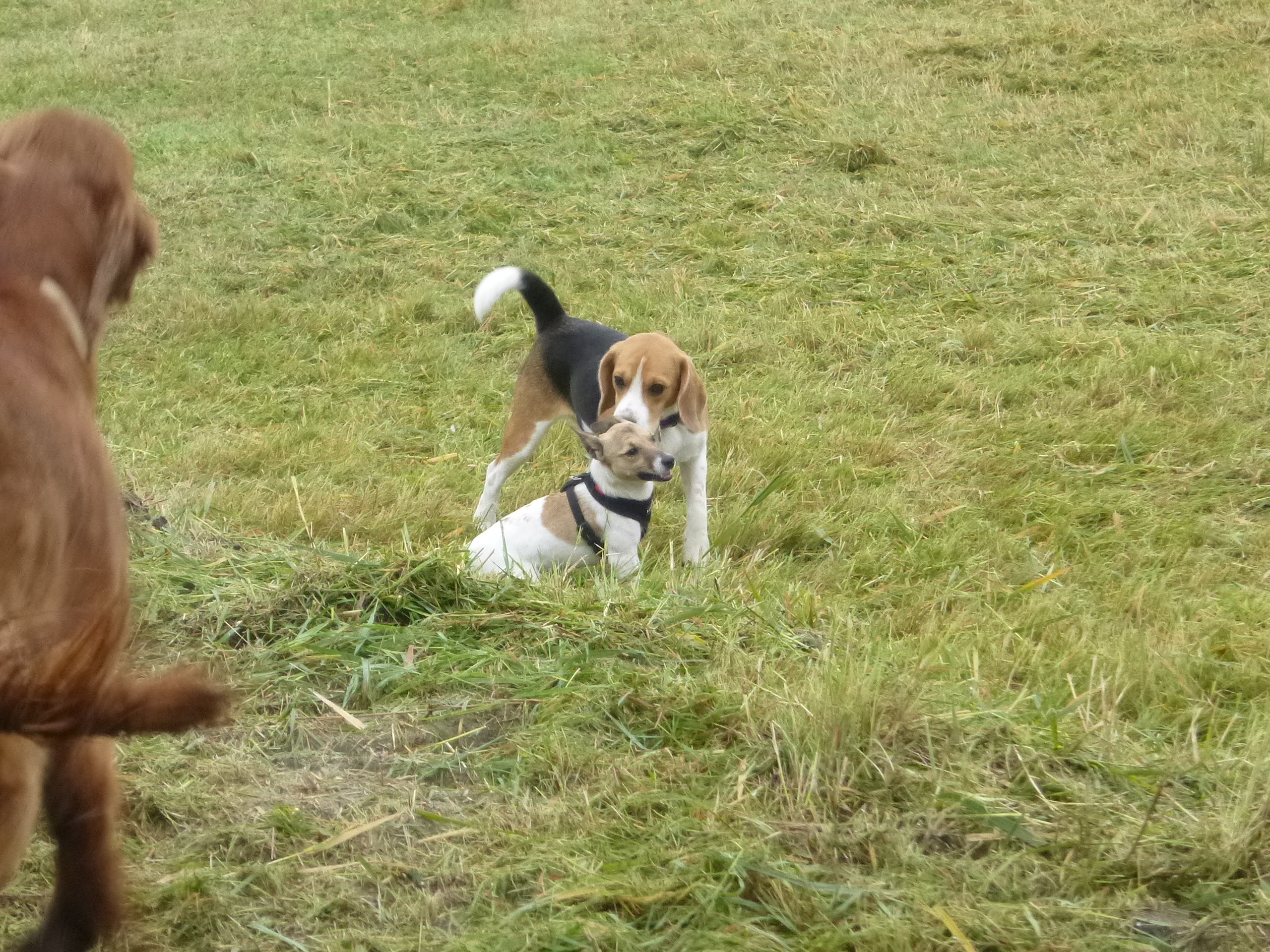 It was a rowdy group of dogs, including one who was trying to learn not to bark (incessantly, relentlessly, and non-stop if he was within 20 feet of another dog), with loving owners and a gentle teacher. They use rewards instead of punishment, though not clickers. I liked it.