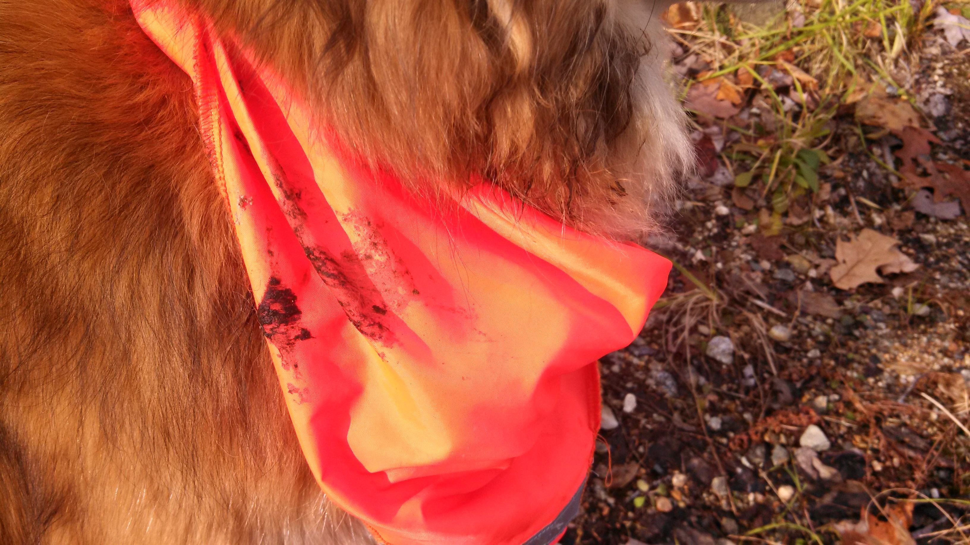 The next day, he came back from somewhere with black, sticky, smelly something all over his neck, shoulder, and ruff.