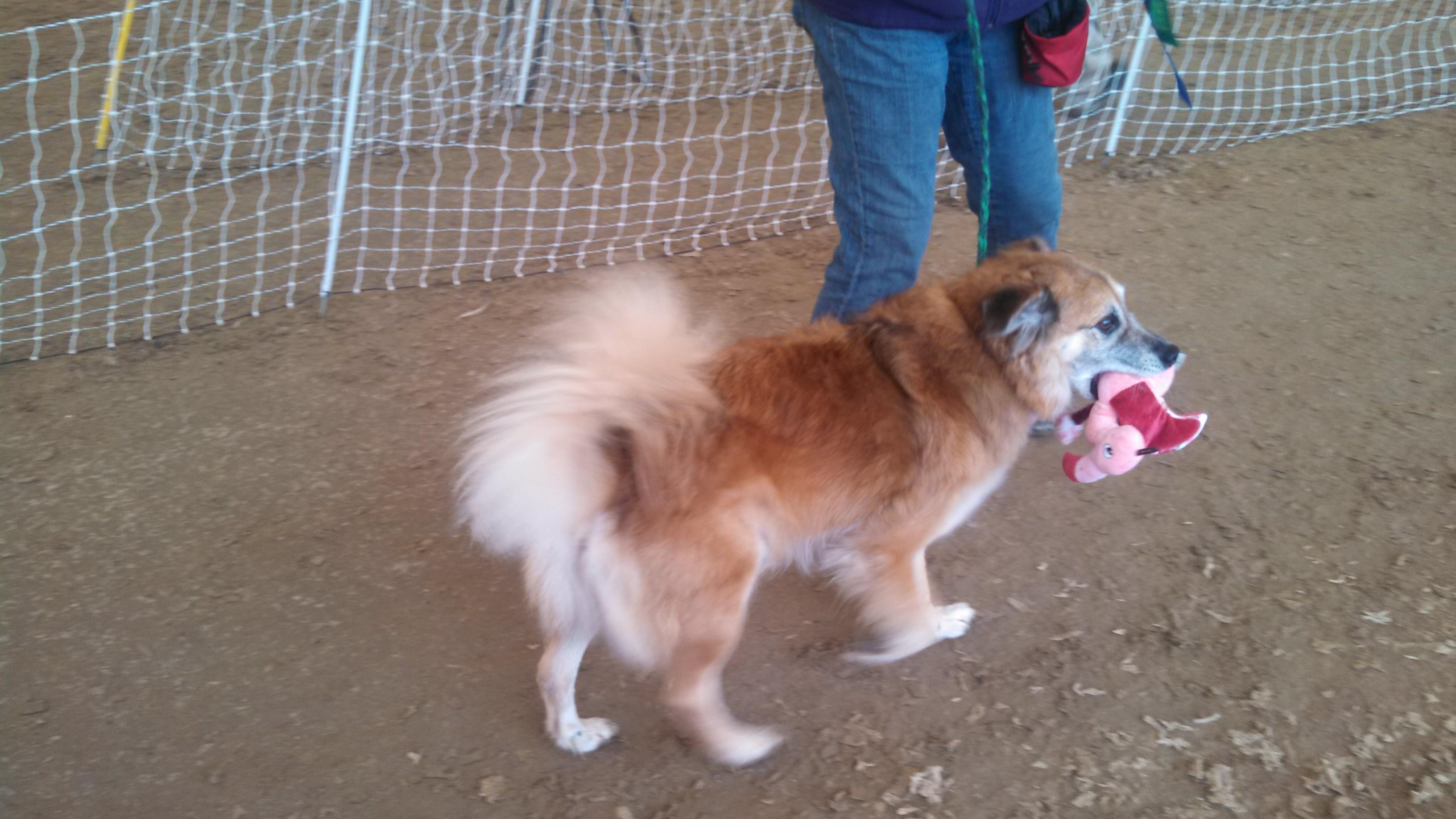 Chico’s first place in Open Standard not only got him advanced to the next level in that game, it allowed me to pick him a toy. I selected a Tony Bahama (fancy!) pink flamingo. And he thought it pretty terrific. I swear that he knows when a toy came as a prize and is extra proud of it.