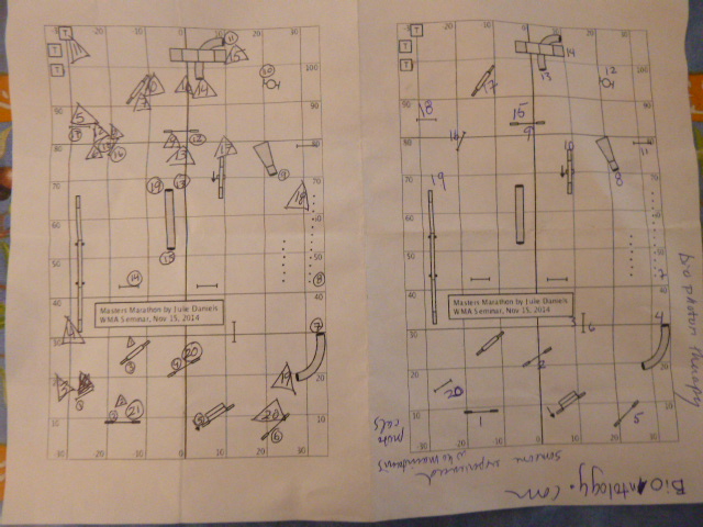 On Saturday, we spent all day (like, 8AM to 6:30PM) at Julie’s, as participants in a marathon agility session/seminar. I think we did six different courses that day, all of them at maters or international level. Julie critiqued each run for all eight of us. Well, by 4PM, it was down to six of us. Then, because by some small joke of the universe, I live closer to Julie than any of her other students, Chico and I let everyone else have a crack at the last course before us so they could start their long drives home, and it was suddenly 6:30 and we were, in Julie’s words, “the last ones standing.” We were all wrapped up in the seminar (you can learn a lot from listening to what Julie has to say about someone else‘s run), so no pictures, except this one of my map.