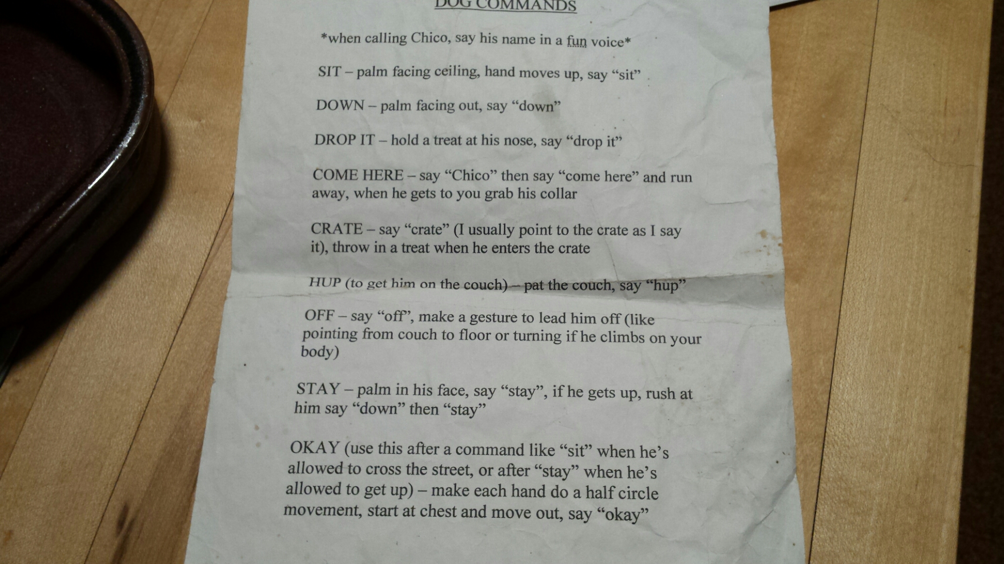 I’m working on the boxes that didn’t get unpacked during the big push to make the house livable and this turned up. This sheet of paper came with Chico, but it took me many months to find it the first time, tucked in with all the supplies that came with him. I was so busy in those early days figuring out how to manage him that I never made it to the bottom of the Chico basket.