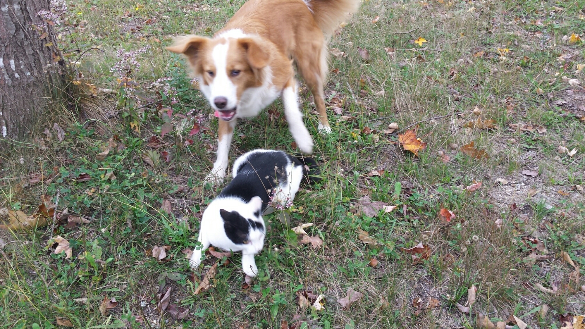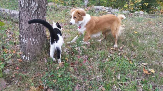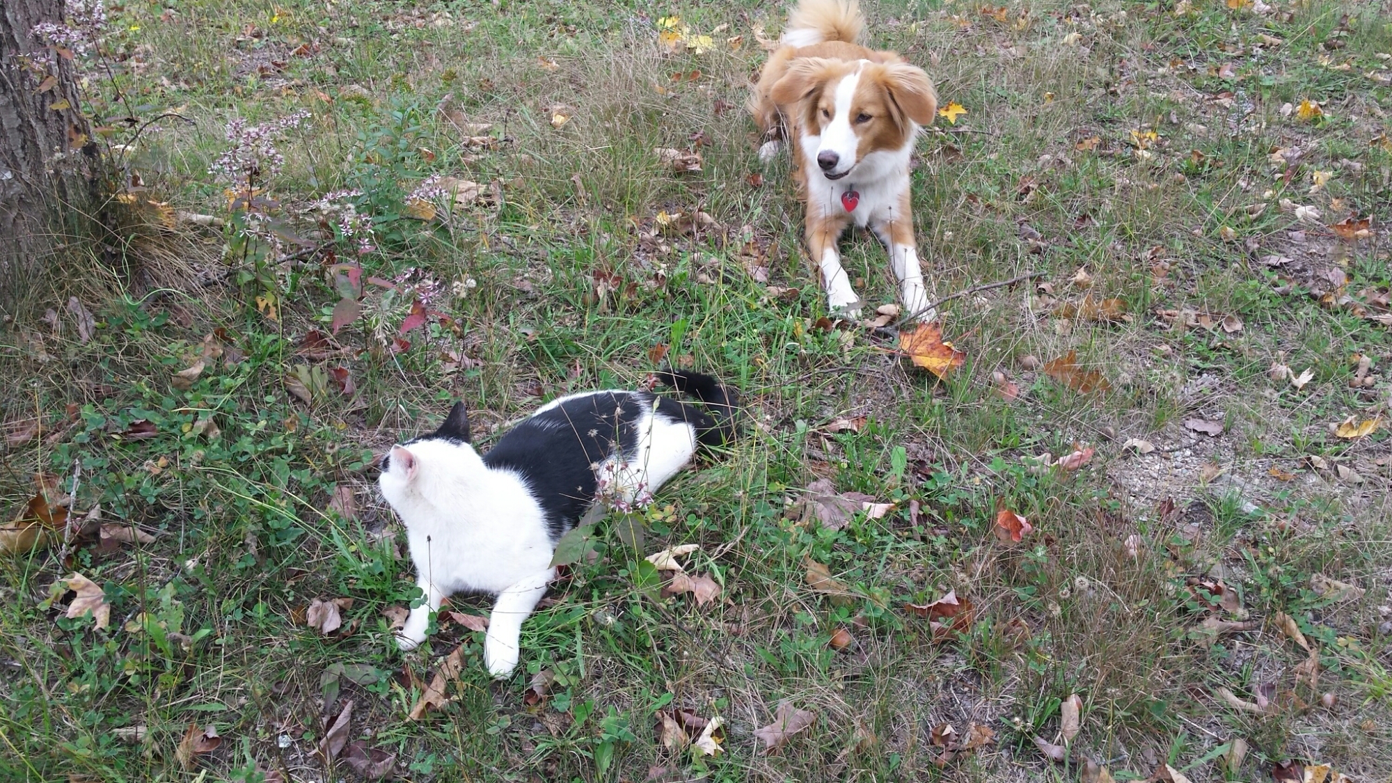 After this, kitty ran away,  but not far, and not up a tree. They played, in a way, for a little longer,  and then Bonney happily came to me.