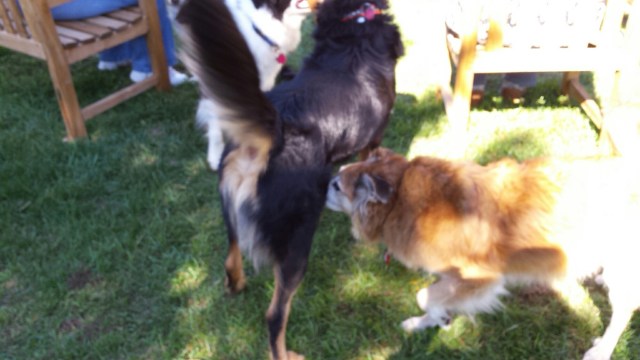Maybe forty dogs in a large fenced yard. Potluck lunch. Chatting. An auction to benefit the national rescue organization that sent Bonney to me.