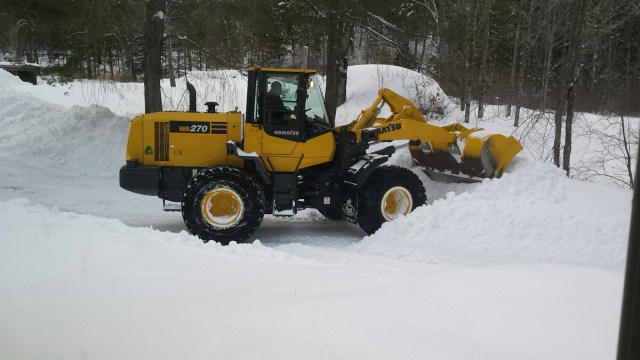 The other day, between storms, the plow guy sent the front loader to push back and move snow from right by the house to the snow mountain at the end of the driveway.